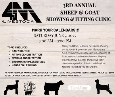 Come and spend the day at our show barn with friends. Learn hands on how to get your lambs & goats show ring ready. Hailey and Madi McKenzie will share their tips and tricks on making your lambs & goats look their best on show day. Bring your lamb & goat and let them help you practice. For those who wish to stay, they will spend some time working on showmanship techniques in the afternoon. This is sure to be a day filled with FUN and lots of LEARNING.