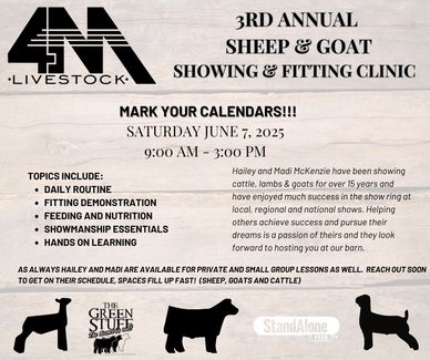Looking to make your lambs, goats or steers shine? 4M Livestock’s Mobile Fitting & Showmanship Clinics bring expert training right to your barn, fairgrounds, or youth group. Hailey and Madi McKenzie offer hands-on instruction in fitting, daily care, nutrition, and showmanship — tailored for beginners and experienced showmen alike.